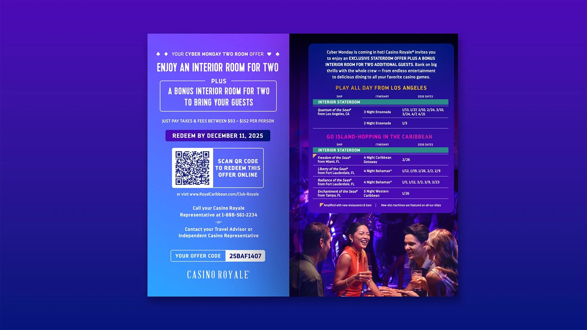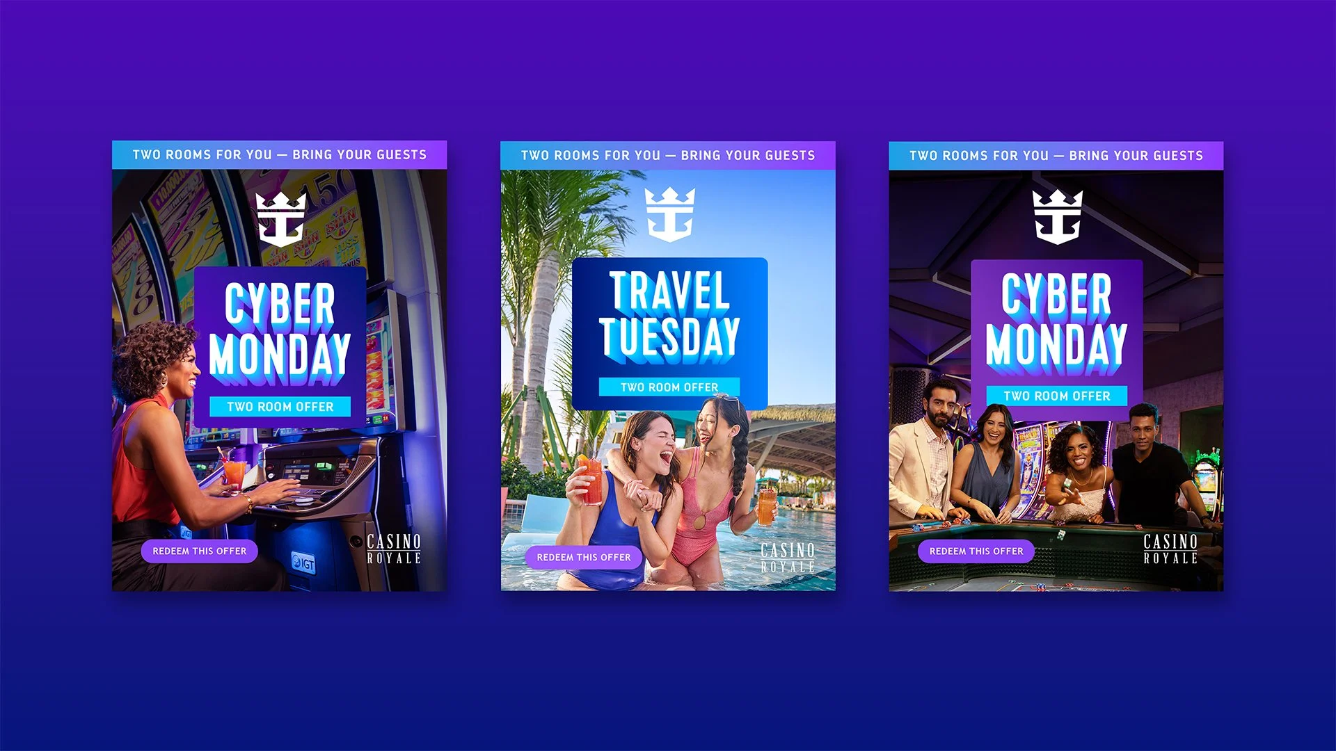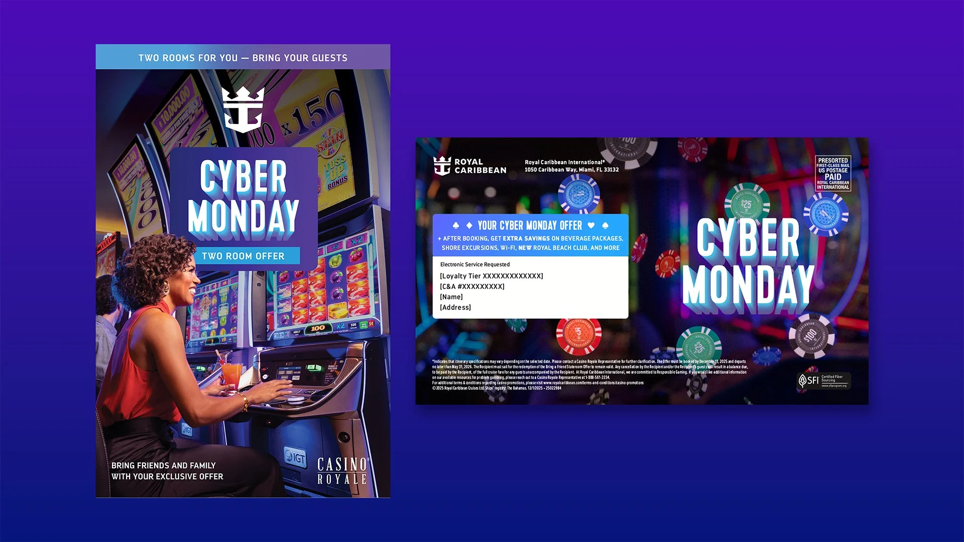 As a continuation of Black Friday, Casino Royale provided guests with a special Cyber Monday promotion. This campaign gave guests an opportunity to book a sailing with a double room offer, a special perk to bring their guests along for their next vacation. The design deliverables spread across both print and digital mediums. The first touchpoint was a direct mail brochure explaining the offer, complemented by three email drops, extending the campaign's reach digitally.