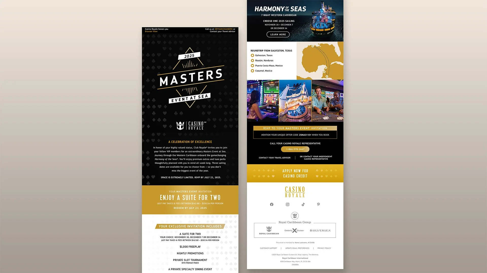 The goal of this campaign was to reinforce the elevated status of top-tier Casino Royale guests, foster excitement, and provide details to RSVP to one of three limited-capacity sailings. Key design deliverables included updated event branding, event invitation, and onboard collateral.