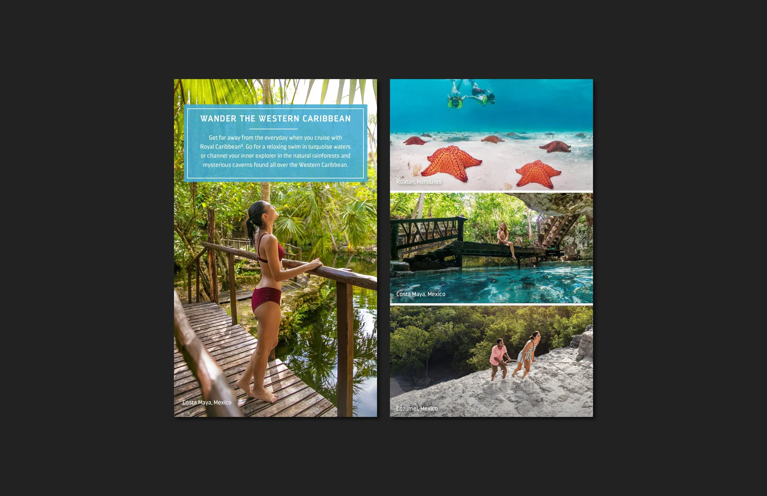 When fully open, the center panel reveals the complimentary room details, available sailing dates, as well as special onboard promotions and gifts to expect during the event. The right side of the folder holds two inserts– a map of each port, and secondary information about shore excursions alongside destination imagery to excite guests.